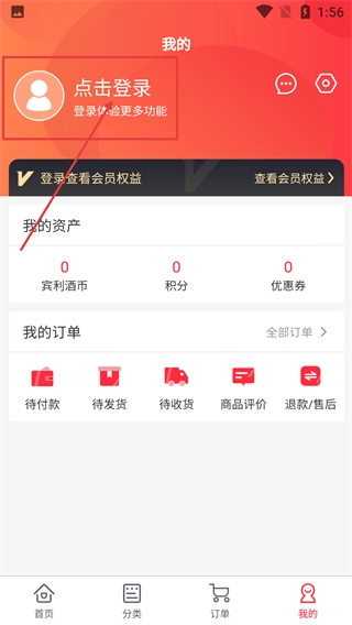2、进入【我的】界面后,点击【点击登录】按钮可开启登录流程,此界面还包含资产-订单等功能模块入口。