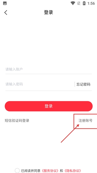 3、在登录界面,点击【注册账号】选项可切换至注册流程,也可选择短信验证码登录的方式完成账号相关操作。