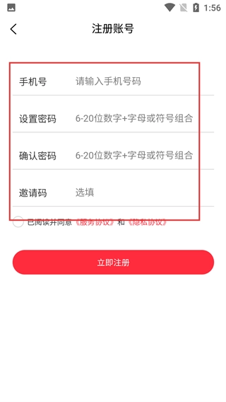 4、在注册账号界面,填写【请输入手机号码】、符合规则的【设置密码】-【确认密码】,选填【邀请码】后可提交注册。
