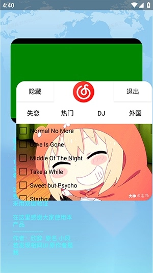 3、主要是免费听各种网易云上面的歌曲,包括失恋、热门以及dj等类型直接点击想听的歌曲就可以播放了。