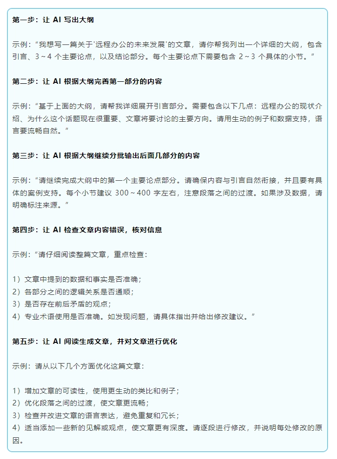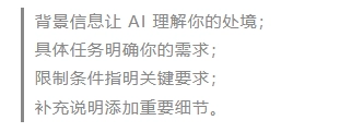 - 使用“四步提问法”:背景 + 任务 + 要求 + 补充。