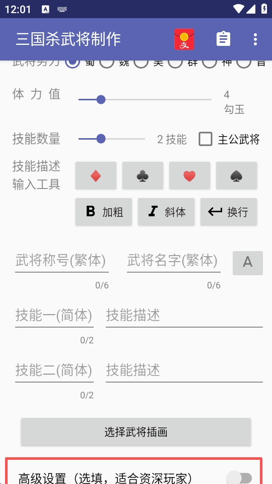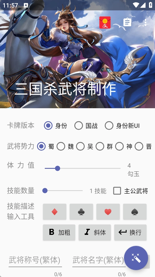 三国杀武将制作器最新版本是一款专门面向爱好者的DIY工具,能帮助用户轻松设计具有个人特色的三国杀武将卡牌。该应用拥有简洁明了的界面,允许用户自主设置武将的阵营、头像、名称、技能以及卡面外观,还提供了蜀吴、魏群等多种跨阵营模板供选择。用户既可以借助这些模板进行修改调整,也能够完全从无到有地创建全新的武将角色。