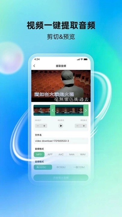 提取音频后可剪切片段,预览后导出,适用于铃声制作和片段分享。