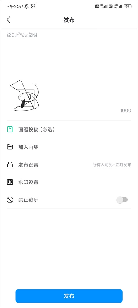 3、点击打开,就能进入发布界面。在这个界面里,你需要添加作品说明,同时还可以使用画题投稿说明、发布设置、水印设置等功能进行相关配置。