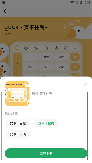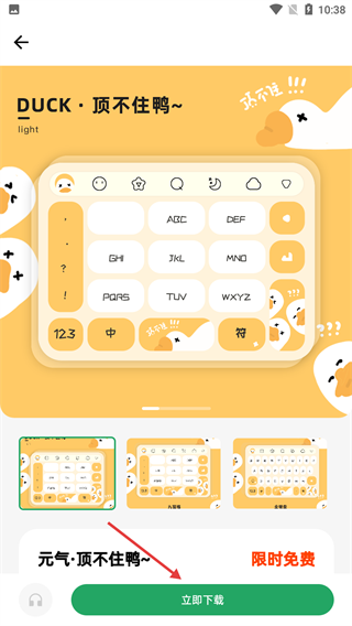 1、在键盘皮肤首页,点击心仪的“元气·顶不住鸭~”键盘皮肤区域,进入该皮肤详情页。