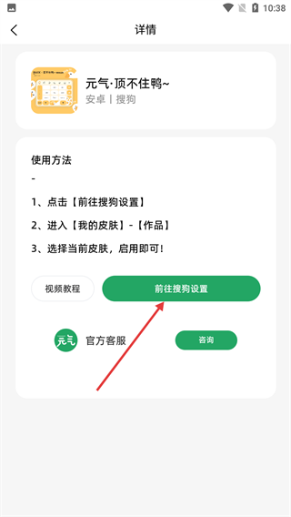 4、完成后,点击【前往搜狗设置】,按照使用方法进入【我的皮肤】-【作品】,选择该皮肤启用即可。