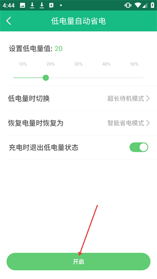 4、在低电量自动省电设置页面,点击【开启】按钮,完成低电量自动省电功能的开启操作。