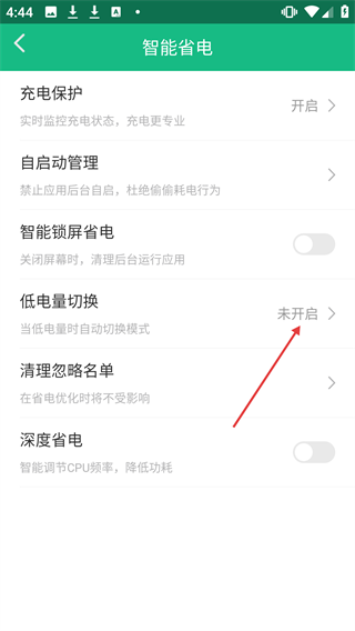 3、在智能省电界面点击【低电量切换】,进入低电量自动省电设置页面。