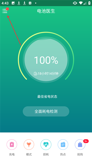 1、点击电池医生左上角的菜单按钮,展开功能列表。