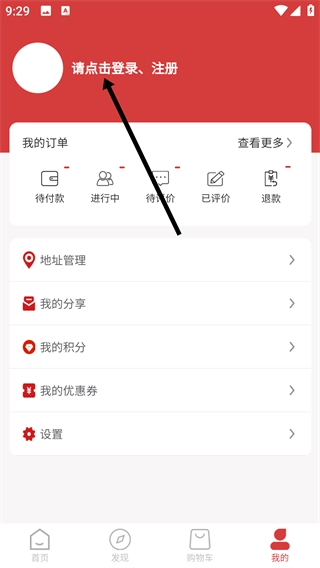 2、进入对应页面后,点击【请点击登录、注册】区域完成账号操作,后续可使用【我的订单】-【地址管理】等功能。