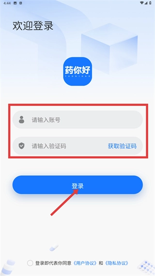 1、在“药你好”弹出的服务协议与隐私政策窗口中,仔细阅读《用户协议》和《隐私政策》后,点击【同意并接受】按钮,即可进入应用的登录环节。