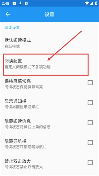 3、在设置界面点击【阅读配置】,进入阅读配置界面,能自定义阅读模式的功能哦。