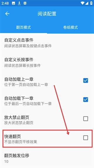 4、在阅读配置界面勾选【快速翻页】,即可开启不显示翻页平移效果的快速翻页功能啦。