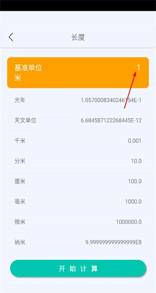 2、进入长度单位转换页面,基准单位设为米,输入数值,准备点击开始计算完成转换。