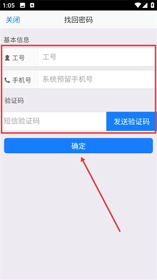 2、进入找回密码页面,依次填写工号、系统预留手机号,点击“发送验证码”获取短信验证码并填入,最后点击“确定”完成密码找回。