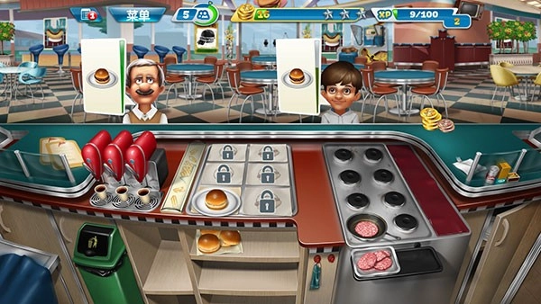 6、这时候你就可以用自己营业后得到的金币升级自己的厨具、食物和饮料了,后期还会解锁新的东西,记得积攒你的金币来进行购买。
