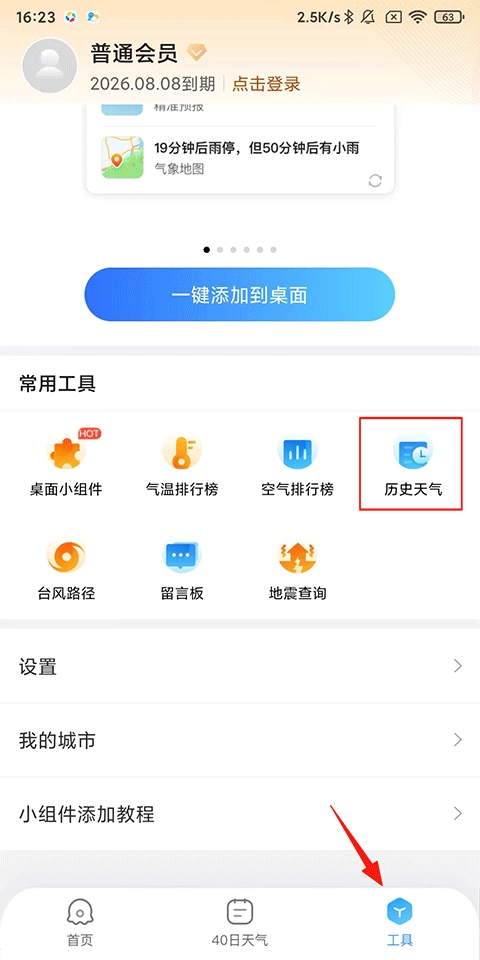 1、启动2345天气王应用,依次点击工具选项、常用工具分类,最后选择历史天气功能。