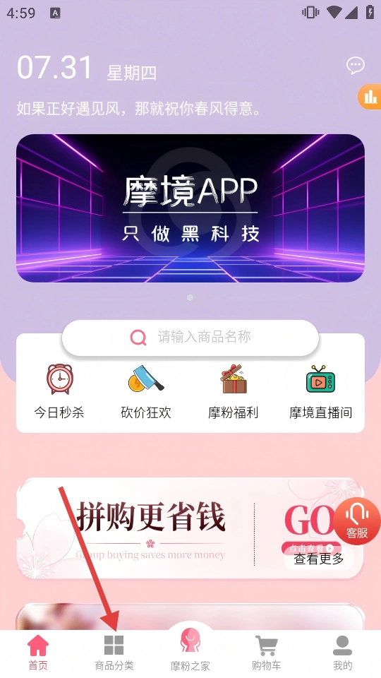 1、进入【摩境】首页后,点击底部导航栏中的【商品分类】按钮,即可进入商品分类页面。