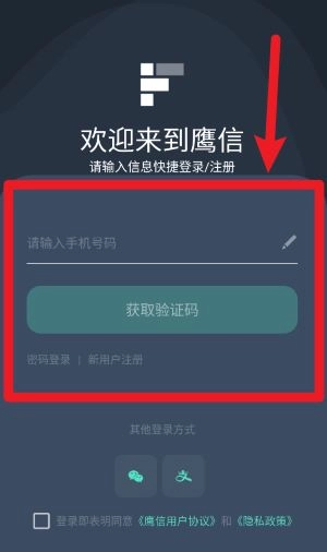 1、打开App后,需先在欢迎界面输入手机号码获取验证码,以此完成快捷登录或注册操作。