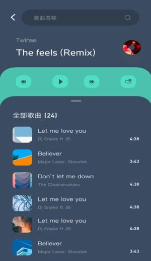 3、进入音乐播放界面后,可通过播放控制按钮切换歌曲、暂停播放,并浏览当前播放列表中所有音轨内容。