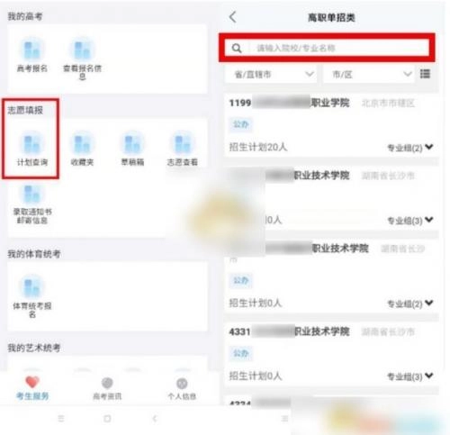 3、通过【志愿填报】→【计划查询】,查询可填报的高职单招院校专业组计划。