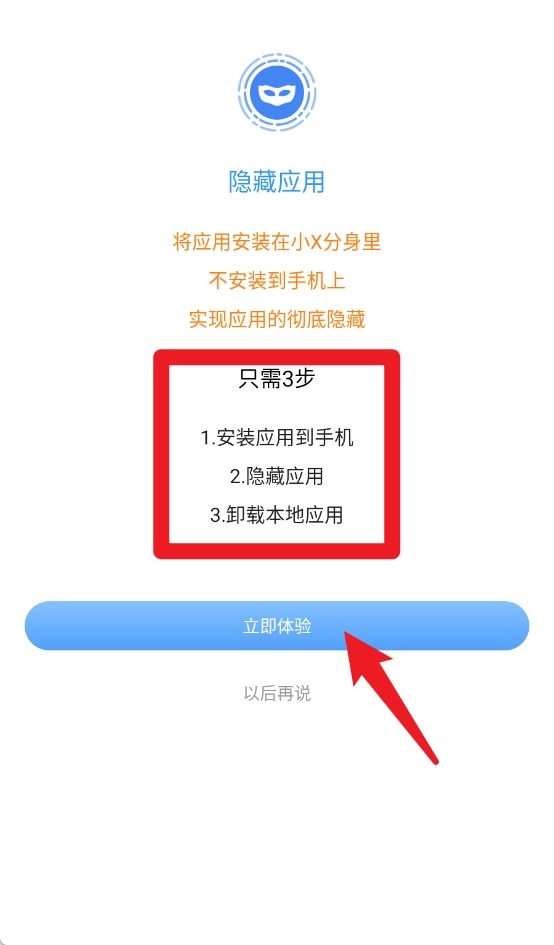 2、点击隐藏应用后按提示操作三步,即可实现应用安装后隐藏再卸载原应用。