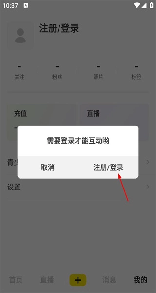 3、弹出提示框,显示需要登录才能互动的提示,提供取消和注册登录两个操作选项。