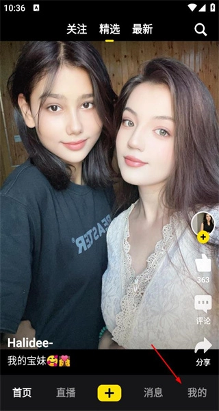 1、打开软件后,进入精选页面,这里会展示用户发布的内容,同时配有点赞、评论和分享按钮;接着点击“我的”,即可进入对应的个人页面。