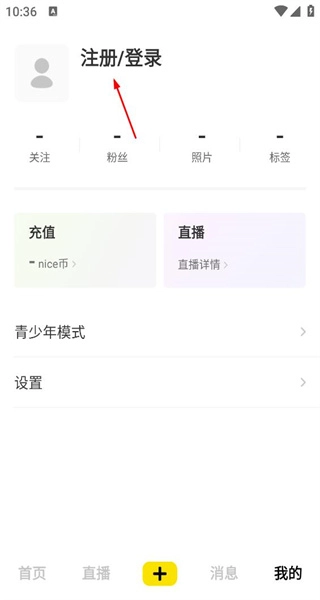 2、进入我的页面,顶部显示注册登录按钮,下方有关注粉丝等统计项,点击注册登录按钮。