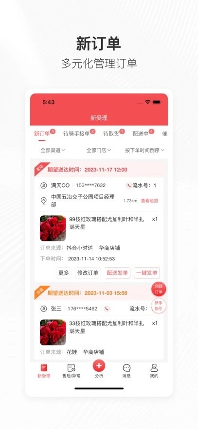 - 连锁品牌保障:连锁品牌门店可通过管单宝就近分配门店订单,多店支持员工权限管理。
