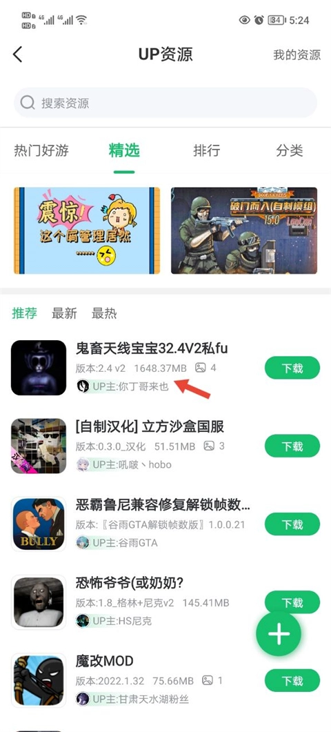 4、如果不知道有什么up的话,也可以点击软件首页中的up资源。