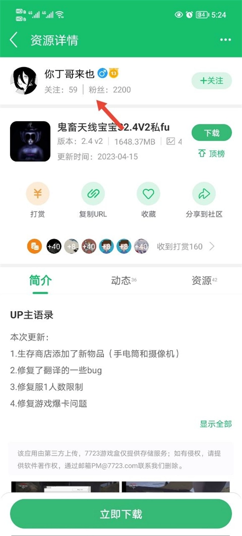 3、来到他的主页之后找到资源栏进行点击,就可以看到他的所有游戏资源。