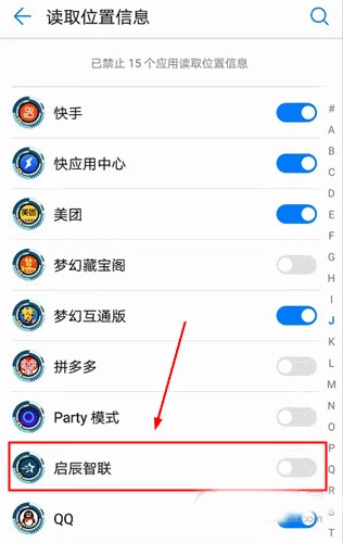 2、然后在权限管理功能界面下选择”读取位置信息“的功能,在该界面下找到启辰智联应用,将权限关闭即可关闭软件的定位了。