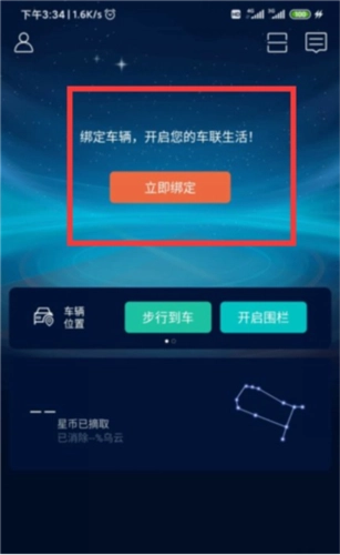 4、注册成功后进入主页面会显示绑定车辆,开启您的车联生活。点击立即绑定。