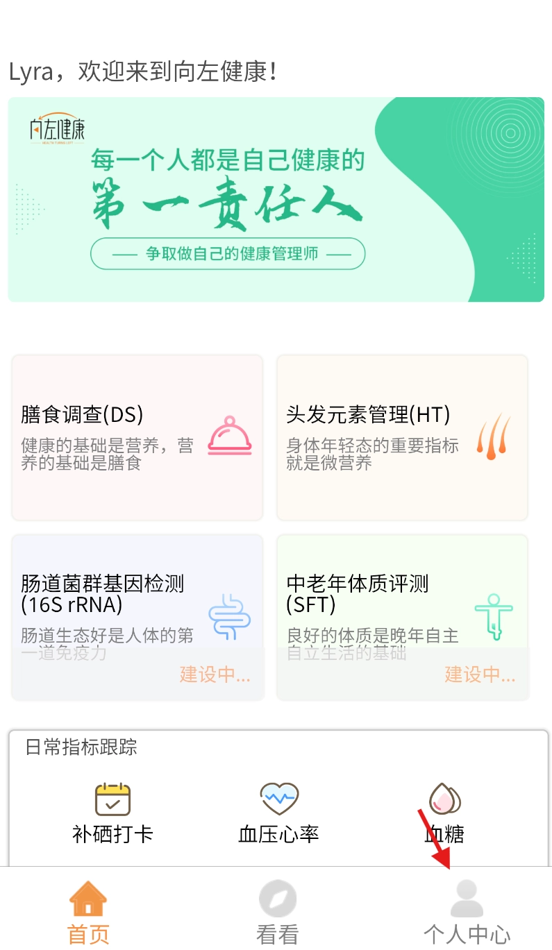 1、启动向左健康应用,在界面底部找到“个人中心”入口,点击进入个人专属页面。