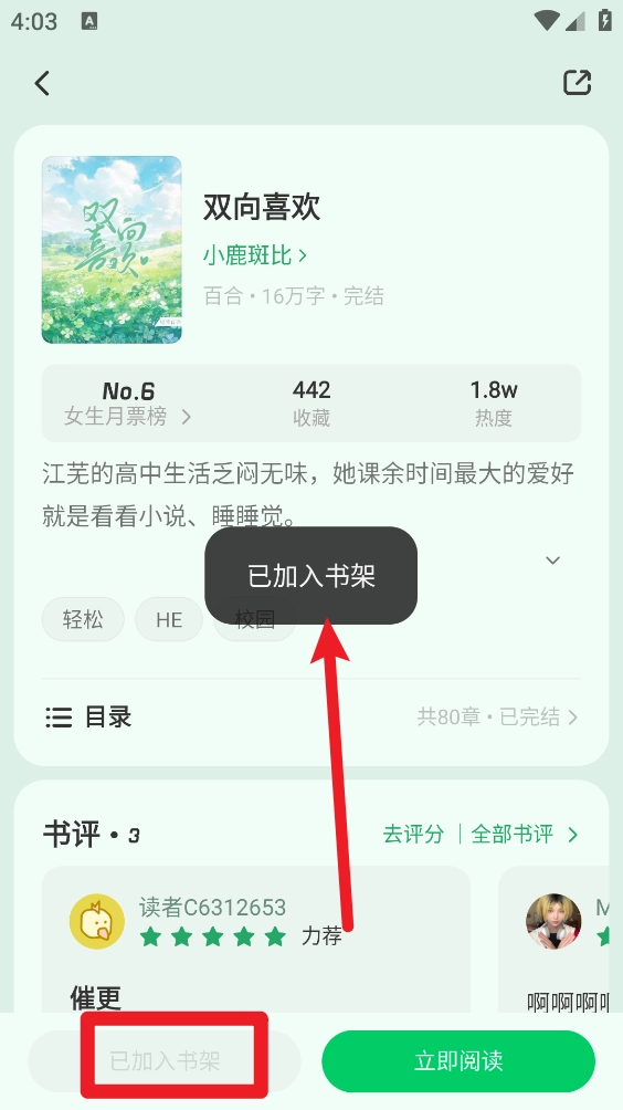 3、在小说详情页点击"加入书架"按钮即可。