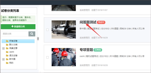 3、点击试卷管理进入试卷管理页面,该页面可以进行试卷新建可以进行试卷分类管理等