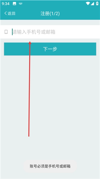 3、进入注册界面,在指定输入框准确输入手机号或邮箱,完成后点击下一步,推进注册流程。