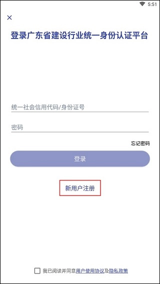 请打开“粤建通”App,点击主页页面的【新用户注册】,根据实际情况进行注册。