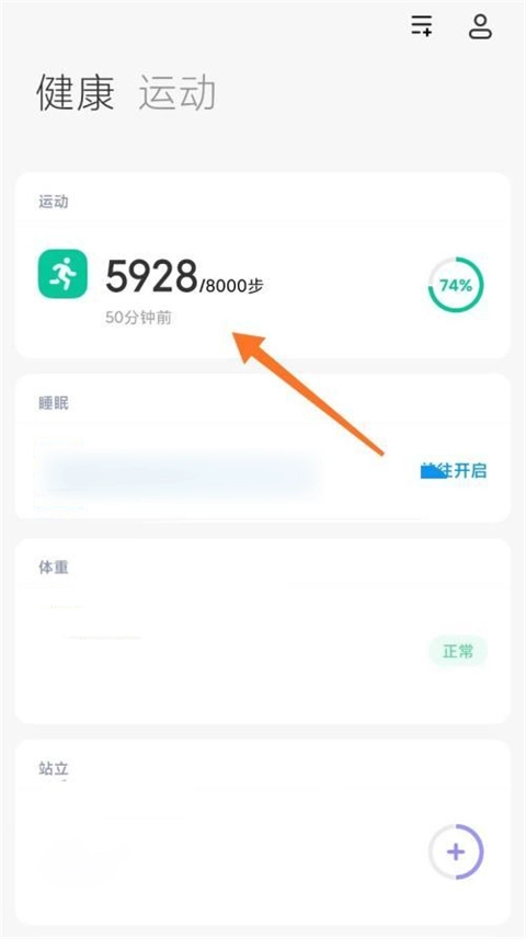 采用卡片式布局,将运动相关数据(步数、距离、卡路里)与健康信息(睡眠、心率)这三个链接置于首页最顶部,以便用户快速查看。