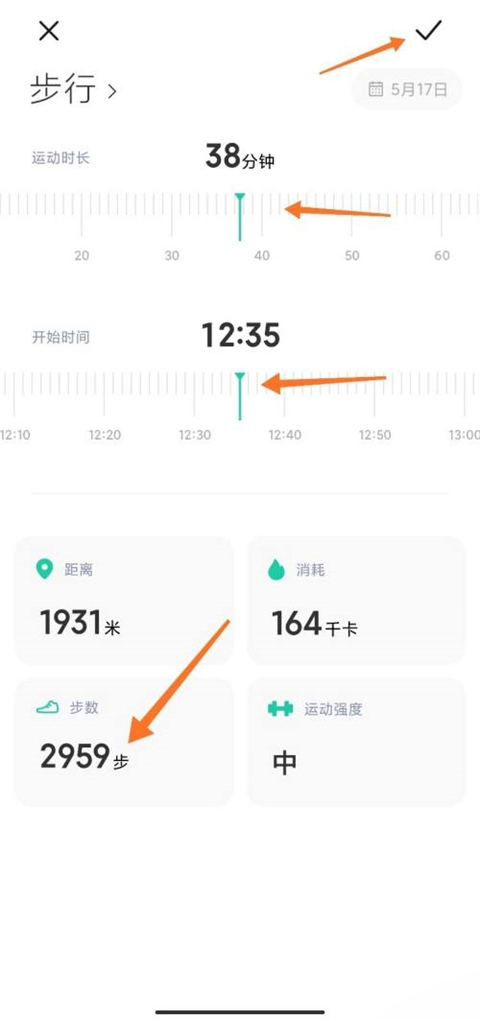 6、最后修改你的运动时长,步数也会随之发生改变,然后点击右上角的确定即可。