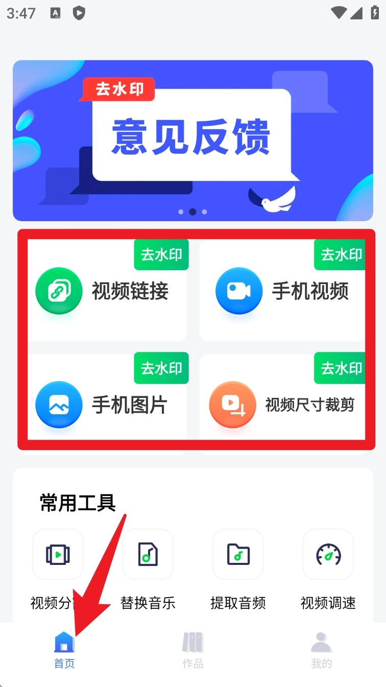 1. 进入首页后,你可以通过选择视频链接、手机视频、手机图片等途径导入素材,点击对应图标就能启动去水印处理流程。