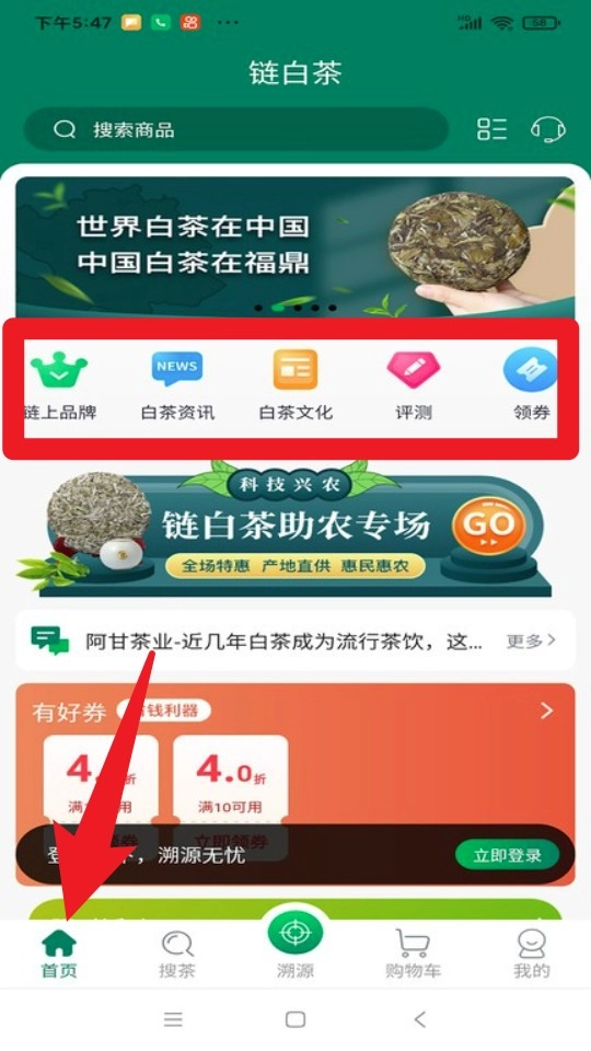 1. 打开App后,点击首页的链上品牌、白茶资讯等板块,就能快速了解产业动态、白茶文化以及专属福利。