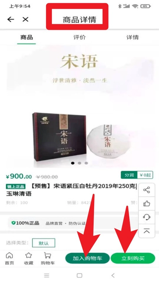 2. 进入商品详情页后,可点击加入购物车或立即购买按钮,轻松下单喜欢的白茶产品,支持分润标记。