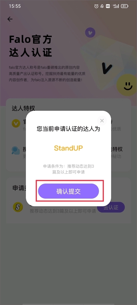 3、了解达人特权以及申请的类型,点击下方的去认证。