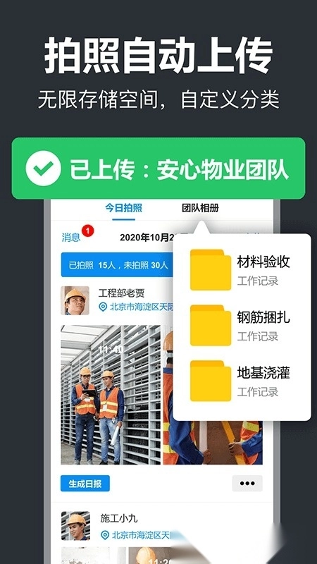 1、拍摄照片后系统会自动上传至团队,并同步转发至钉钉、企业微信等平台,全程无需手动干预操作 2. 支持按自定义规则分类存储,提供免费无限容量空间,可随时查阅内容,也能批量导出数据,且不会占用手机本地存储空间