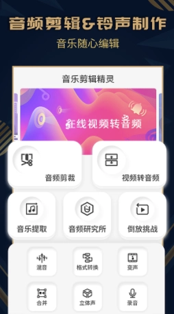 音乐剪辑铃声编辑、剪裁音乐、音频格式转换、音频合并拼接混音、歌曲制作合成、录音变声变音、剪接调整音量大小、淡入淡出、从视频提取音乐、调整速度。