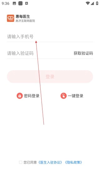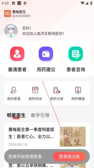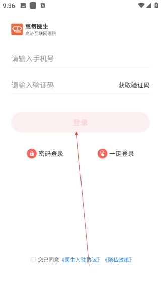 1、打开惠每医生应用,找到【登录或注册】按钮并点击进入相应页面。