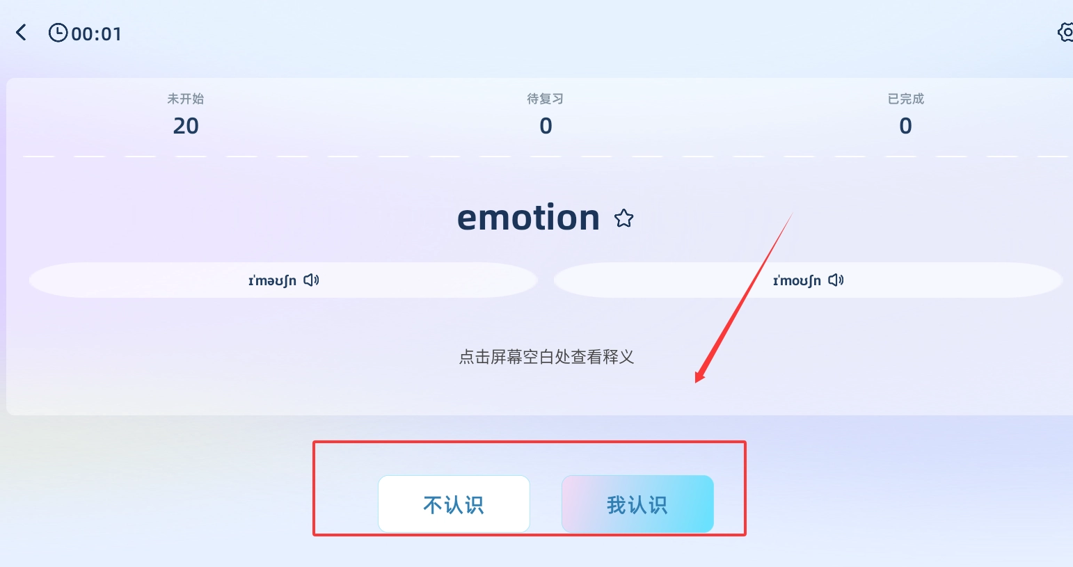 2、适合外语学习者巩固记忆,界面设计简洁直观,操作简单,直接点击认识和不认识即可。
