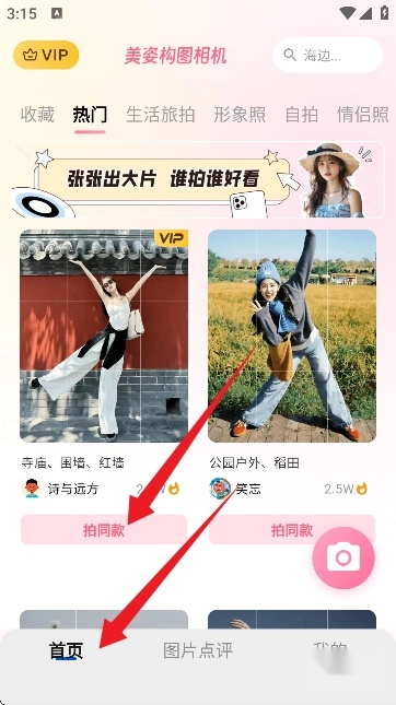3、首页展示海量时尚拍照姿势模板,每个模板均支持"一键拍同款"快捷功能。